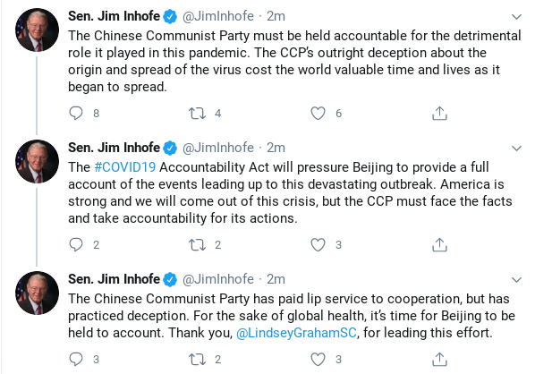 SEE??? There it is- @JimInhofe blaming China for the spread of COVID-19 when he mocked the virus weeks ago. Remember he made $400K by selling off his stock when the pandemic started. #InsiderTrading #VoteThemOut https://twitter.com/abbybroyles/status/1258200137223925760 …pic.twitter.com/nwbxgFlOFG