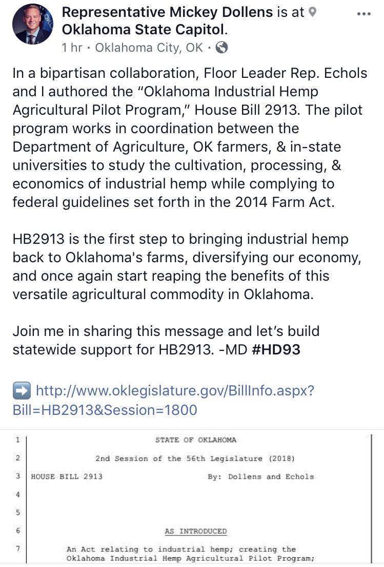 Oklahoma Industrial Hemp Agriculture Pilot Program. http://webserver1.lsb.state.ok.us/cf_pdf/2017-18%20INT/hB/HB2913%20INT.PDF …pic.twitter.com/P3CjrFuGSy