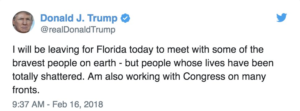NEW: Pres. Trump announces he will be leaving for Florida today in the wake of the deadly shooting at Marjory Stoneman Douglas High School on Valentine's Day, adding he is 'working with congress on many fronts.'pic.twitter.com/zWLb8542TH