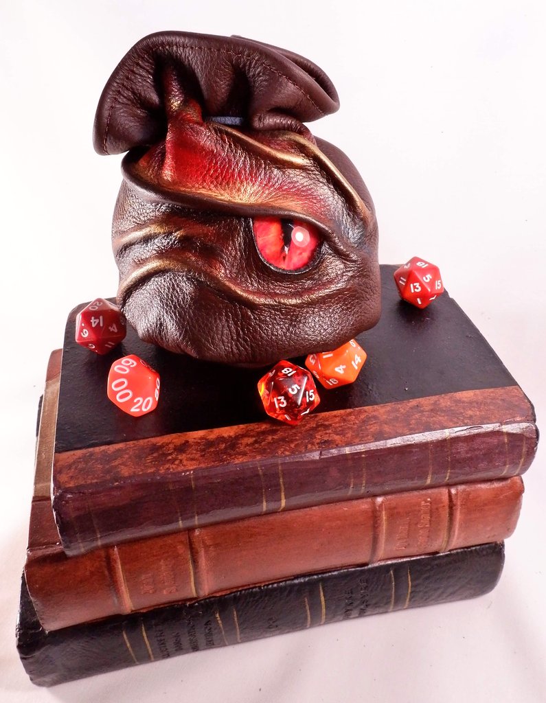 A Fire Dragon Dice Bag with a Hand Painted Dragon's eye for 90 Dice. http://www.etsy.com/shop/embraceleather …