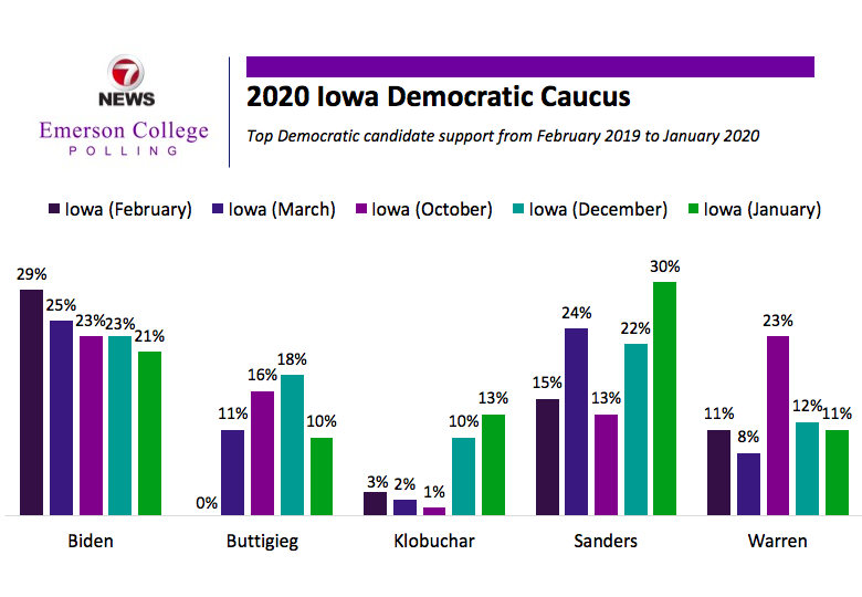 @7News Iowa Poll: Movement in Iowa over the last year- Biden: 29% to 21% (-8) Buttigieg: 0% to 10% (+10) Klobuchar: 3% to 13% (+10) Sanders: 15% to 30% (+15) Warren: 11% to 11% (+0) https://emersonpolling.reportablenews.com/pr/iowa-2020-sanders-solidifies-frontrunner-status-in-iowa-while-klobuchar-nears-viability …pic.twitter.com/5Nj9YkhF6Y