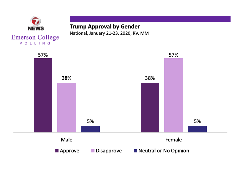 @7News / Emerson College Poll: Trump Approval by Gender: Women- 38% approve | 57% disapprove Men- 57% approve | 38% disapprove https://emersonpolling.reportablenews.com/pr/national-2020-biden-and-sanders-battle-in-two-way-race-for-democratic-nomination …pic.twitter.com/rDakQAvfGx