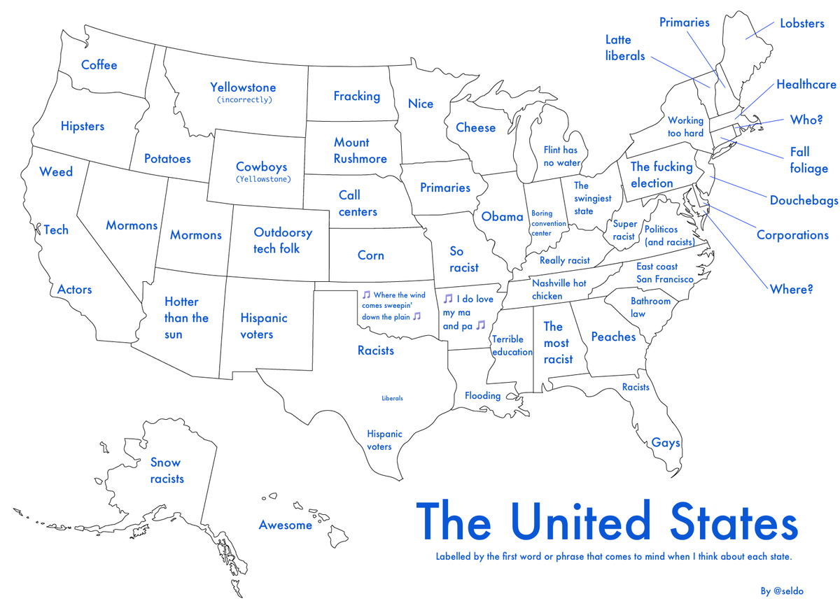 For no reason, here is a map of the United States labelled according to the first word or phrase that comes to mind about each place.pic.twitter.com/z6hZKkplEX