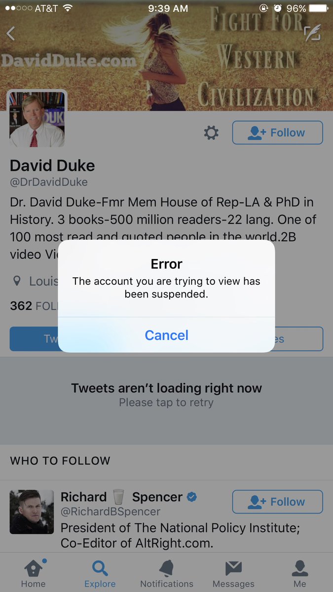 Twitter has suspended David Duke's account. Happy Monday. cc: @ChrisEvanspic.twitter.com/zHEOmz8MoO