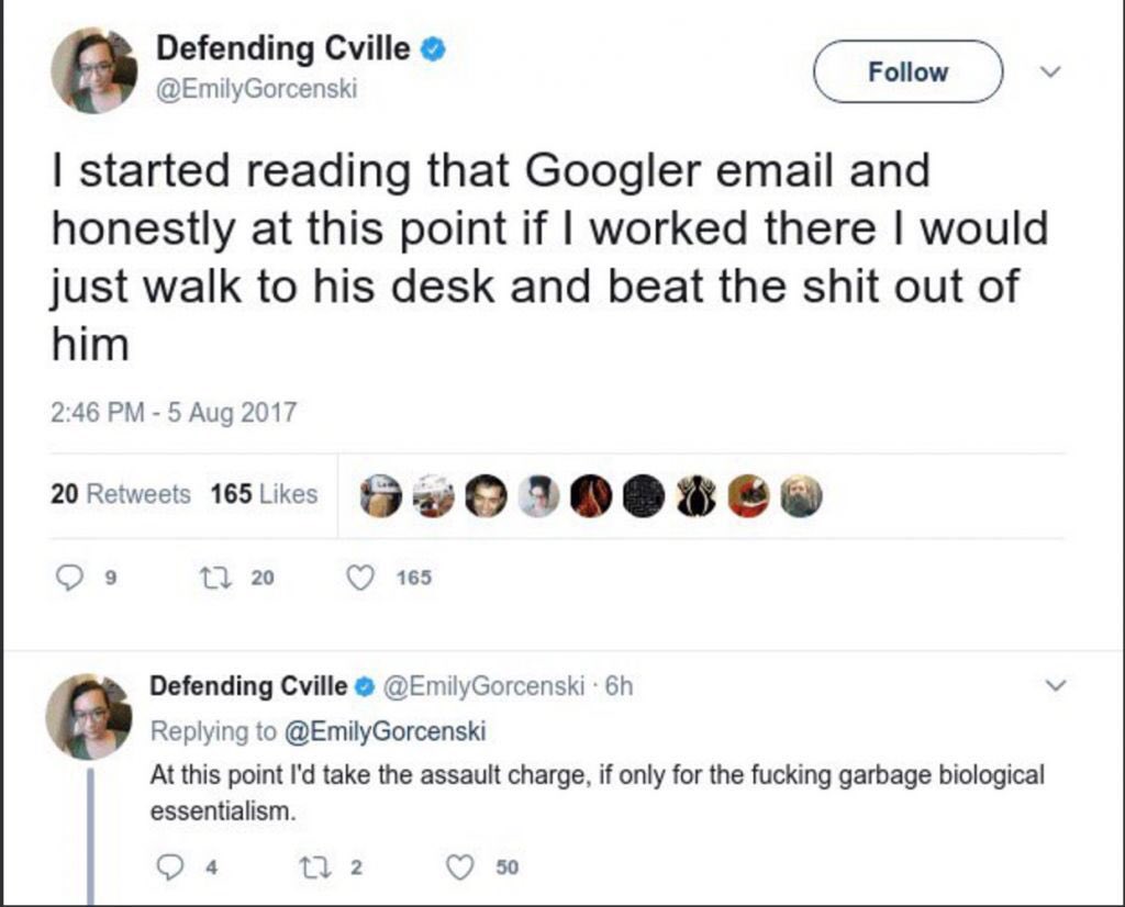 Aren't you the same person who said you'd punch Damore if you worked with him? (commitment to nonviolence) LIBERAL HYPOCRITE