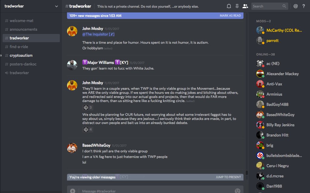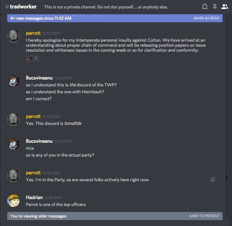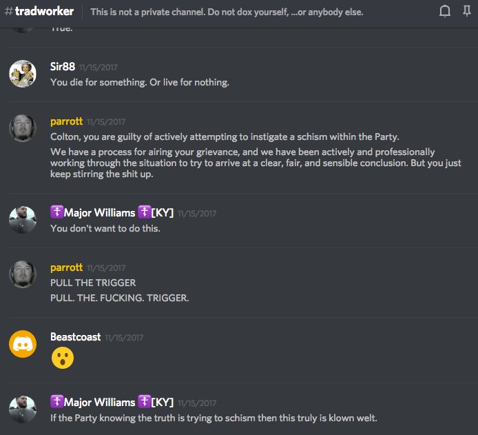 While TWP leaders claimed their party was the “only viable group” in contemporary American white nationalism, chat logs show they at times had difficulty wrangling their rank and file members, who mostly wanted to post memes & complain about not having sex https://www.unicornriot.ninja/2018/leaked-a-year-inside-the-failed-neo-nazi-traditionalist-worker-party/ …pic.twitter.com/A7otxQx7eS