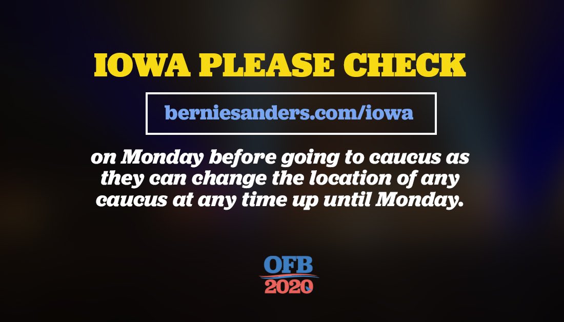 ATTN Iowa Caucus Goers: The Sanders campaign confirmed that some of the caucus locations are being switched in Iowa PLEASE triple check http://berniesanders.com/iowa on Monday before going to caucus as they can change the location of any caucus.
