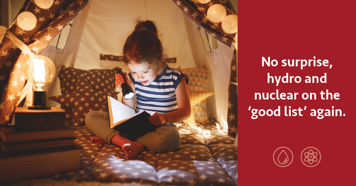 Your clean, carbon-free electricity is brought to you today by reliable, full-time hydro and nuclear power.