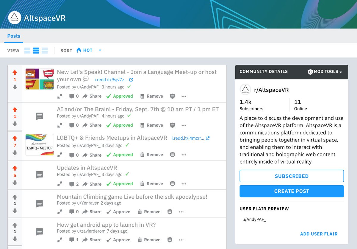 A place to discuss the development and use of the AltspaceVR platform. A communications platform dedicated to bringing people together in virtual space. http://www.bit.ly/AltVR-Reddit-profile …pic.twitter.com/hMubD9gJs5