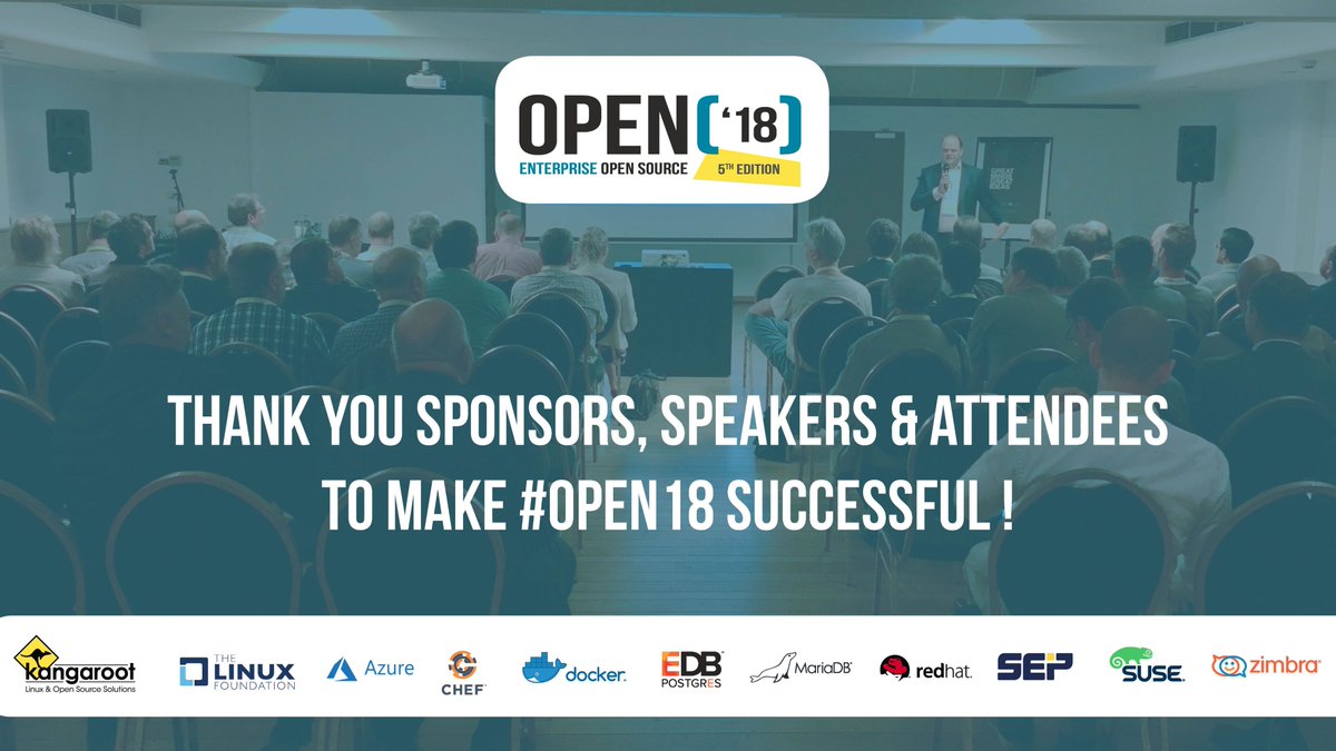 Big thanks to all attendees, speakers & our sponsors @chef @Docker @EDBPostgres @mariadb @SEPHybridBackup @SUSE @Zimbra @linuxfoundation @Azure @RedHat for another great edition of #OPEN18! CU you next year at #OPEN19 #opensource #enterpriseopensourcepic.twitter.com/I47Ju3Tog6
