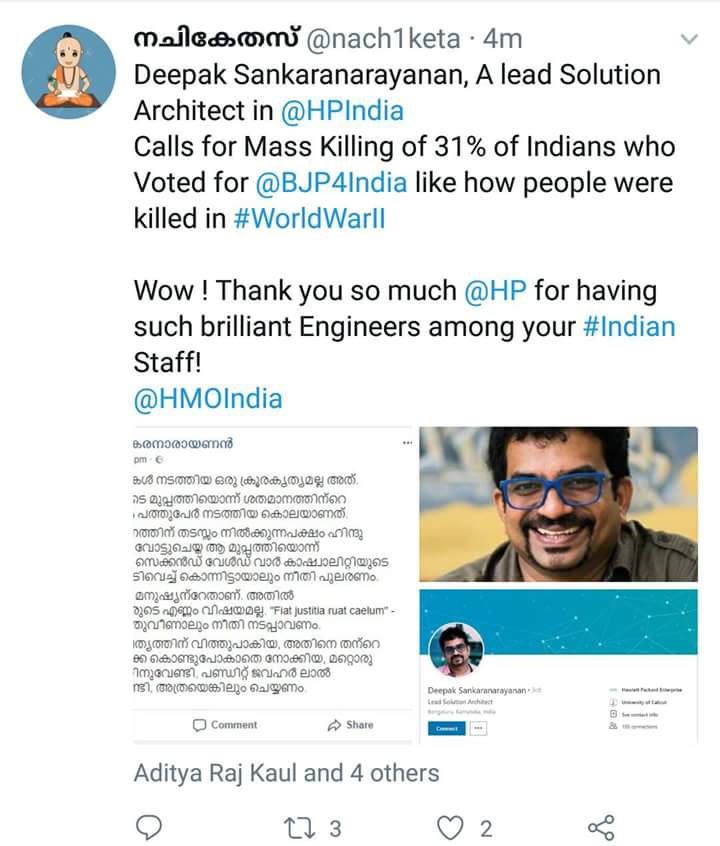 Deepak Sankaranarayanan, employee of HP india demands mass killing of 31% Indians voted for BJP, which includes our Prime Minister, President & Vice President.