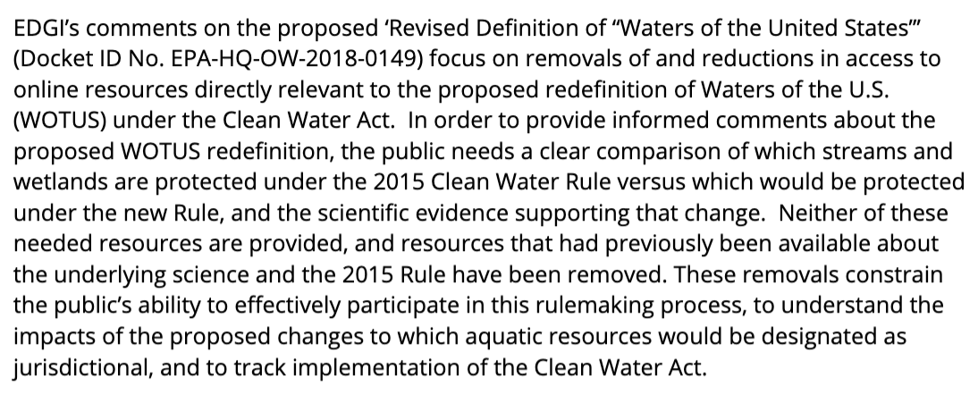 Not only has EPA ignored this science, it has also taken steps to remove this information from its most public medium, its website. EDGI members wrote about those removals and the proposed rule changes here: https://envirodatagov.org/wotus-rule-public-comment/ … 2/2pic.twitter.com/TcAMmRAuid