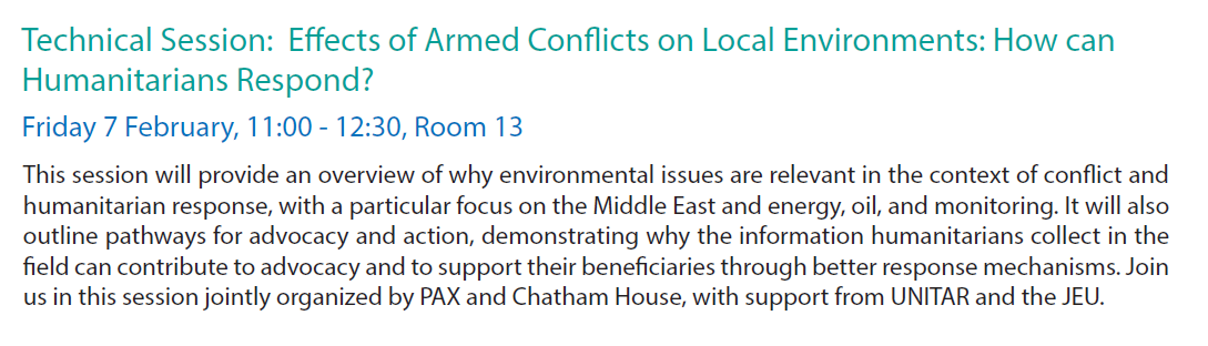 #HNPW20 in Geneve. Join our technical sessions on environment in conflict-settings on Friday Feb 7th, hosted by@PAXforpeace and@ChathamHouse Registration here