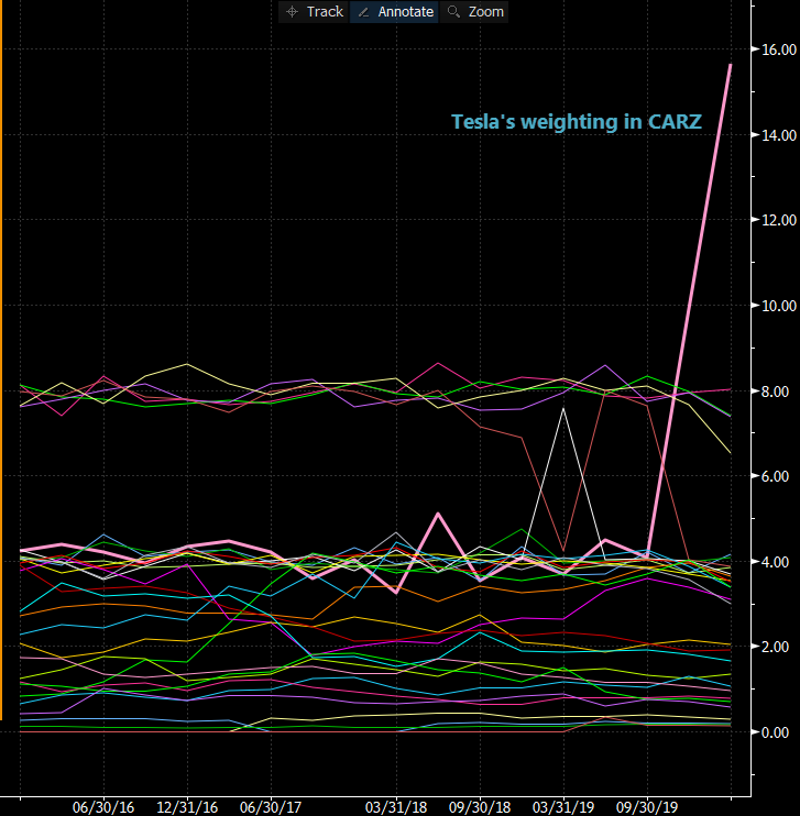 $CARZ (Global Auto ETF) shows$TSLA going from 4% weighting to 16% in about 3mo flat. I've never seen that.pic.twitter.com/2GyYDIvbgV