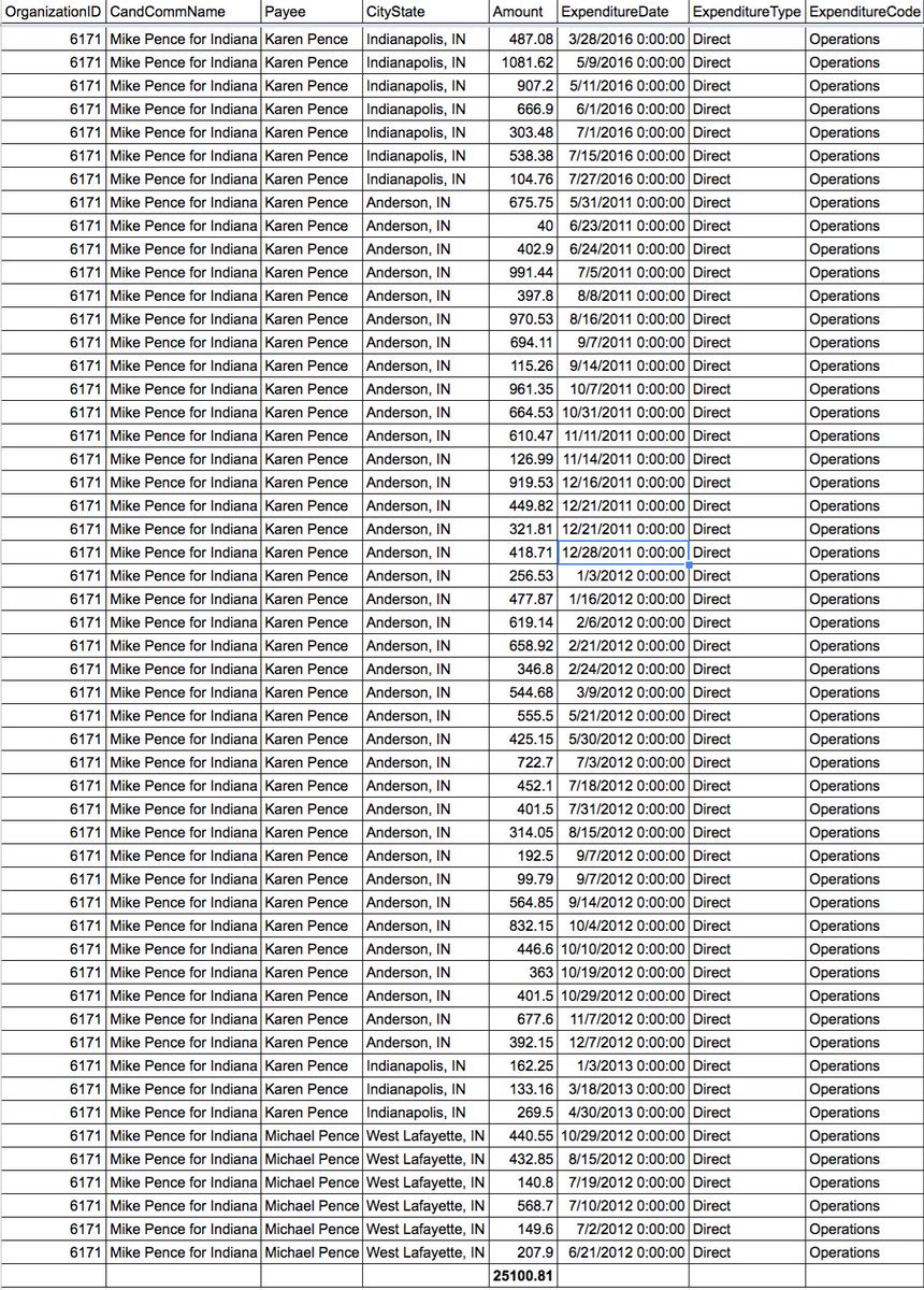 VP Mike Pence & wife were reimbursed 111 times from his State & Fed Campaigns for $64,957.81pic.twitter.com/ZW51FUkf7z