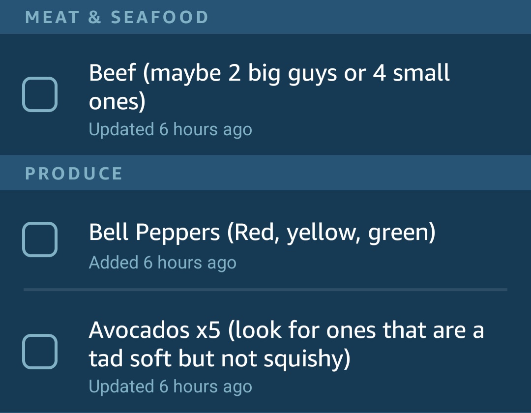 My wife makes me a shopping list for while she is at work, complete with the exact instructions she knew I would call her about if I did not have them