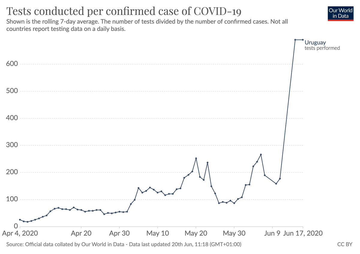 Yes, I'm also very impressed. Crucially Uruguay is also the one country in South America that tests well –> see our Data Explorer here https://ourworldindata.org/coronavirus-data-explorer?zoomToSelection=true&testsPerCaseMetric=true&dailyFreq=true&aligned=true&smoothing=7&country=~URY …pic.twitter.com/3cNlJGwP8R