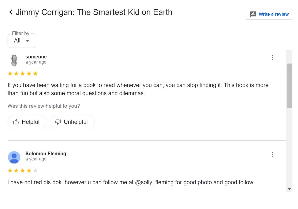 The death of professional criticism is taking longer than expected. I was looking up some stuff on graphic novelist Chris Ware and these are the top 2 audience reviews from Google.pic.twitter.com/xrcfBYKe9P