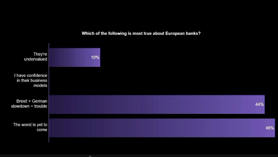 @ErikSchatzker asks the audience to vote on eurobanks.@davidealgebris replies to the result: `There must be quite a few bank employees in the room. They clearly fear for their jobs, and they should.' That said, he thinks they're undervalued.@businesspic.twitter.com/4lzULXh29c