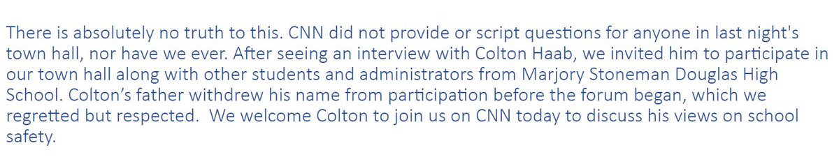 Colton's question was clearly Pro Gun carry by Teachers or staff. CNN had no reason to pull any fast one or feed him a question.... they were willing to have him keep his original question, just not read a lengthy statement.