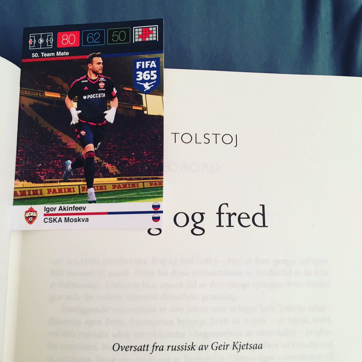 Reading War and Peace without a real bookmark but Igor Akinfeev's panini card is there to save me from dog ears.