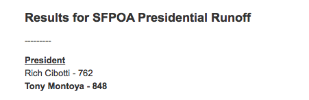 Hello San Francisco insomniacs. Here's some news: Tony Montoya has narrowly held of challenger Rich Cibotti to remain president of the Police Officers Association.pic.twitter.com/zbjdQ0VRTQ