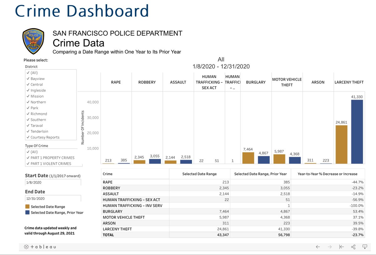 SF crime data does not span multiple years, and I had to break it down between Jan - Dec 20, and what you see is crime going down in almost every category, but …pic.twitter.com/1xhRjCGjtM