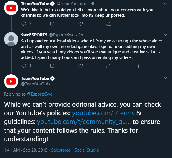 @TeamYouTube @SusanWojcicki so this just happened by youtube support, they said they would help me but then gave me an automated message. When I do original content, and have been for 4 years. This is unfair!pic.twitter.com/7fcRnica5T