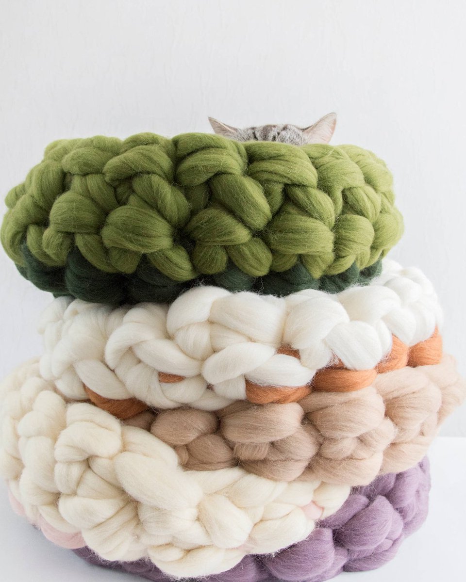 Wishing you a day that’s as warm and cozy as this cat in a stack of chunky knit cat beds.
