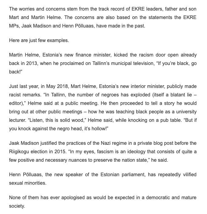 This is Estonia's new Finance Minister... For decades, Estonia has had a reasonably good reputation. That's in tatters now with this new government, which includes these two extreme racists from the far-right EKRE. Summary here from
