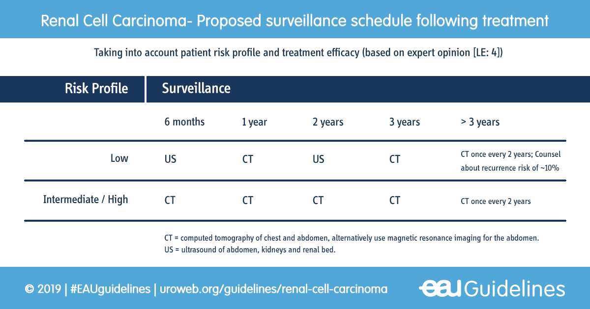 Proposed surveillance schedule following treatment for RCC, taking into account patient risk profile and treatment efficacy.