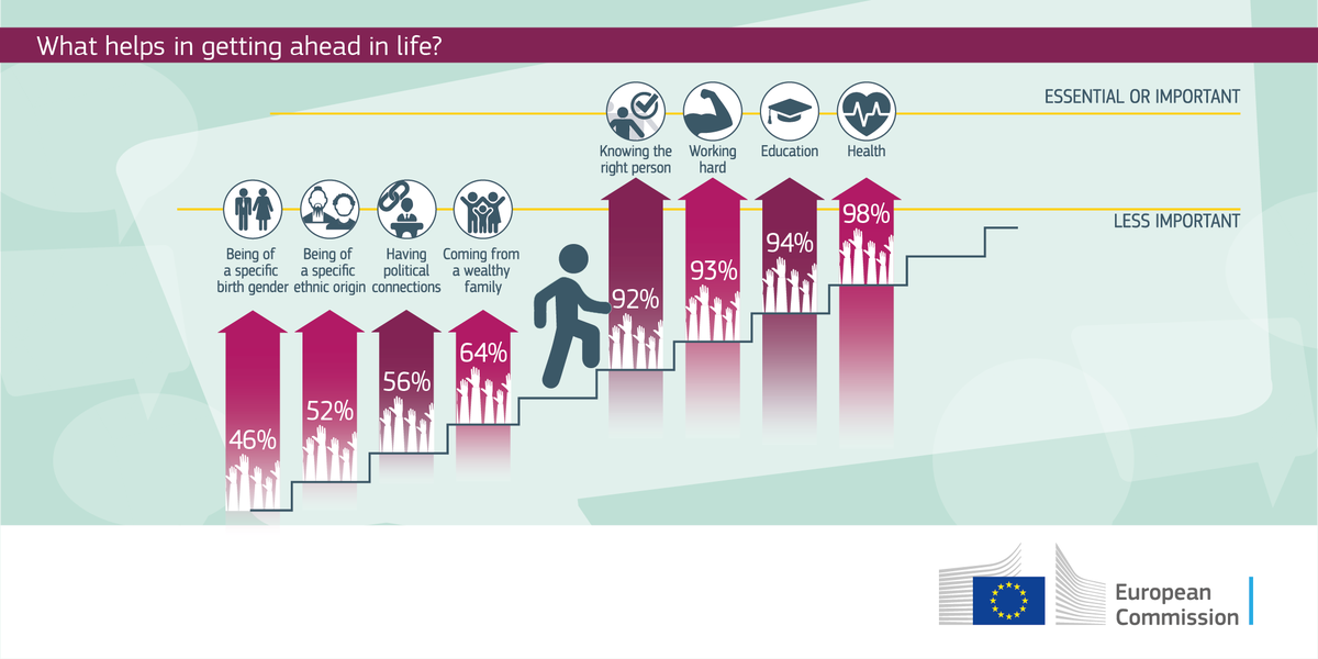 98% and 93% of Europeans consider good health and quality education as essential for getting ahead in life. Working hard and knowing the right people are also deemed important by more than 90% → http://europa.eu/!JP96kB pic.twitter.com/1LowTBZKvD
