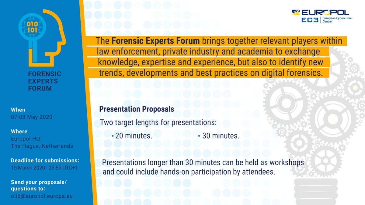 #CallforPapers for this year's#Forensic Experts Forum is looking for contributions. New ideas from academia, industry, government and law enforcement who want to share their knowledge are welcome! See details below and send your contributions to: