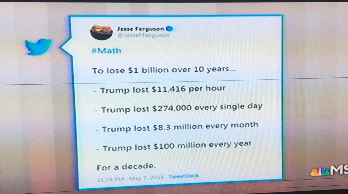 Equivalent: Trump lost $11,416 per hour, every hour....for 10 years. A freaking decade! #TrumpTaxes#BillionDollarLoser#TheArtOfTheSteal@realDonaldTrumppic.twitter.com/dySKunjjT8