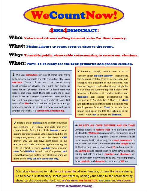 If we're going to have "secure elections," we're going have to roll up our sleeves and work just a little. Computers are riggable, whether by foreign hackers or domestic operatives with inside access. We need non-riggable HUMANS counting the votes.