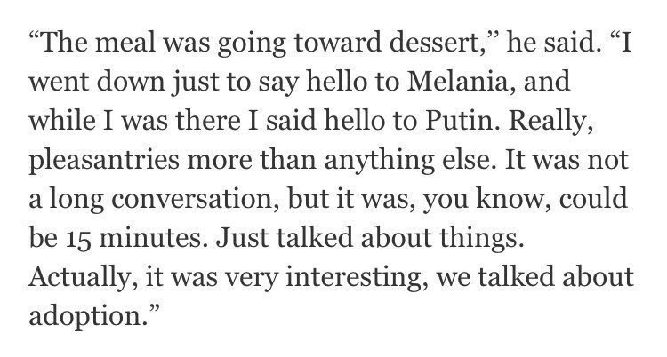 Been waiting for someone to bring up that dinner adoption story when he left his seat to speak with Putin.For me, it has always been suspect