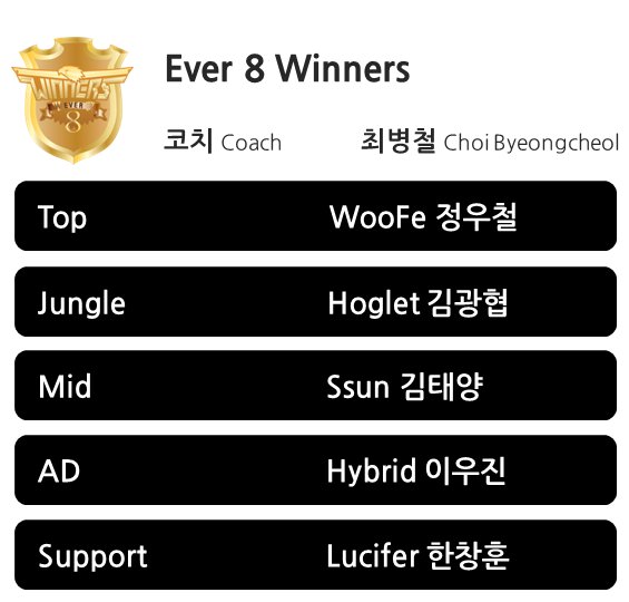 #ever8winners 2018 LoL 챌린저스코리아 스프링 로스터 TOP / EEW WooFe / 정우철 JNG / EEW Hoglet / 김광협 MID / EEW Ssun / 김태양 ADC / EEW Hybrid / 이우진 SUP / EEW Lucifer / 한창훈 Coach / Alvingo / 최병철pic.twitter.com/UT1gS9X6jc
