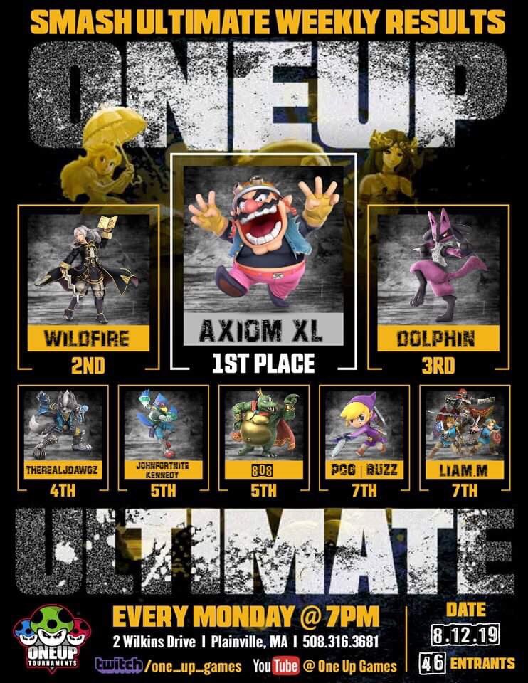 Here are the results from this week's #OneUpUltimate. Thanks for playing everyone! 1. @Axiom_SSB 2. @WildfireMuse 3. @DolphinPKMN 4. @therealjdawgz 5. @JohnFortniteSSB 5. @808SSB 7. @Mountfo_Liam 7. @PCG_Buzz #SmashUltimate #SSBU #Smash #SmashBros #NewEnglandSmashpic.twitter.com/7IIiaagNPP