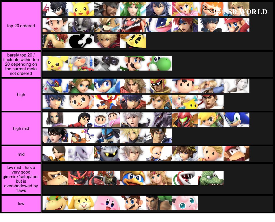 ok so since the new patch is out soon i made a tier list for the first time top 20 is the only one ordered i think there are a lot of characters that aren’t BAD, but aren’t broken like most of the top 20-25 i think theres a sig. dropoff from high>high mid, and from low mid>lowpic.twitter.com/xxoUKjXXVx