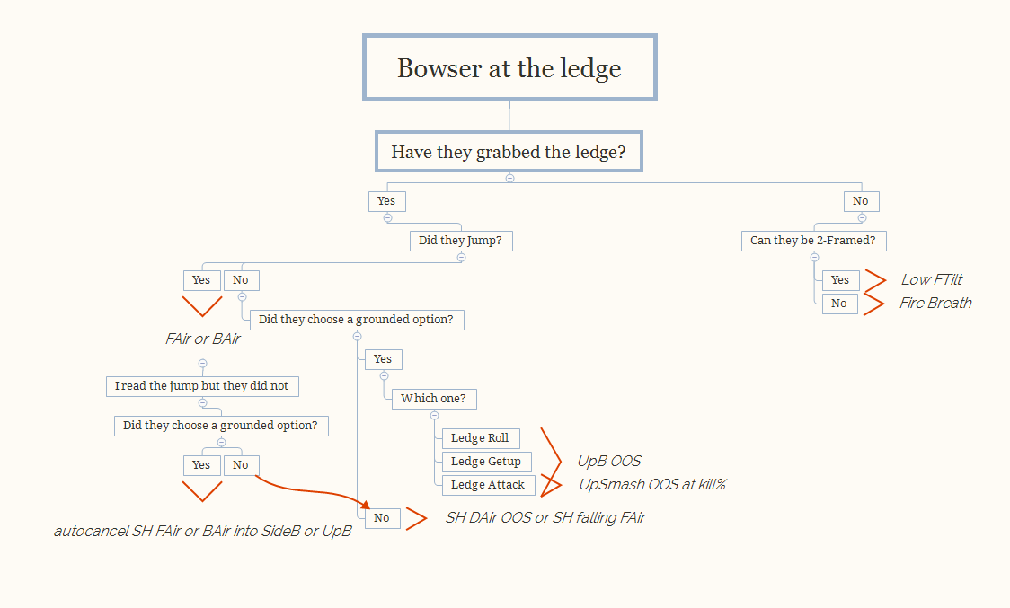 #SSBU_Bowser Ledge Trapping Flowchart v1.0 - Retreating UpB OOS covers 3 out of the 6 ledge options: Ledge Getup, Ledge Roll, and Ledge Attack. - SH FAir covers Ledge Jump and has minimal lag. Of course there is ALWAYS counterplay, that's why covering most options is important. pic.twitter.com/9lrXuIqzvn
