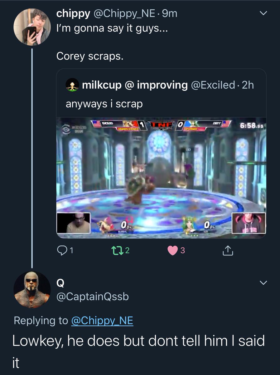 SSBU 🔥🐢 | 11th in MA SSBU | Community Leader for NESU | he/him | toxic | PR Panelist | @CaptainQssb 💖 | priv: @NSFWCorey | Business: ItsExciled@gmail.com