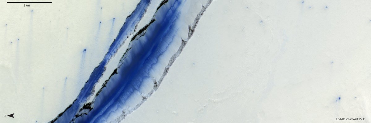This is a segment of Cerberus Fossae trench system. The few hundred metres deep floor is filled with coarse-grained, likely basaltic in composition sand, which appears blue in the CaSSIS false-colour composite image. Notice the small impact craters in the nearby flatlands!pic.twitter.com/5xrhRSi9aK