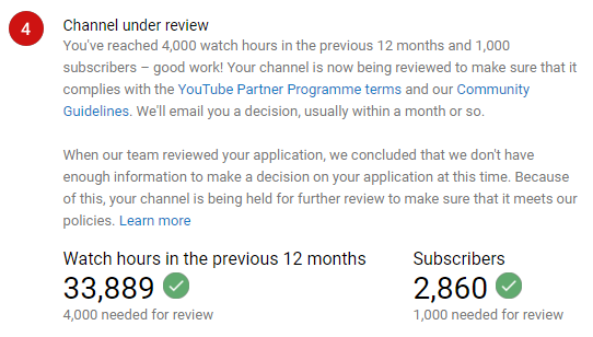 .@TeamYouTube my channel has been like this since April 2019 and yet I still haven't been reviewed. If I am not getting approved because you want to decline me, I'd rather it said I was declined rather than saying I am in review. Please can someone review my channel soon, thanks.pic.twitter.com/ZlN7O9jkXP