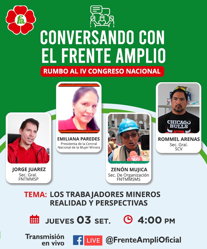 Hoy #ConversandoConElFrenteAmplio| Quedan invitad@s para nuestra#SesiónVirtual, hoy hablaremos de "Los trabajadores Mineros, realidad y perspectivas" con la participación de diversos#DirigentesSindicales de la FNTMMSP y FENUTSSA.