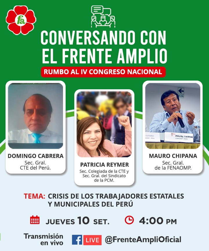 #ConversandoConElFrenteAmplio Las y los invitamos a nuestra#SesionVirtual del Frente Amplio, donde discutiremos sobre la Crisis de los trabajadores Estatales y Municipales del Perú con la participación de dirigentes sindicales de la (CTE-Perú).
