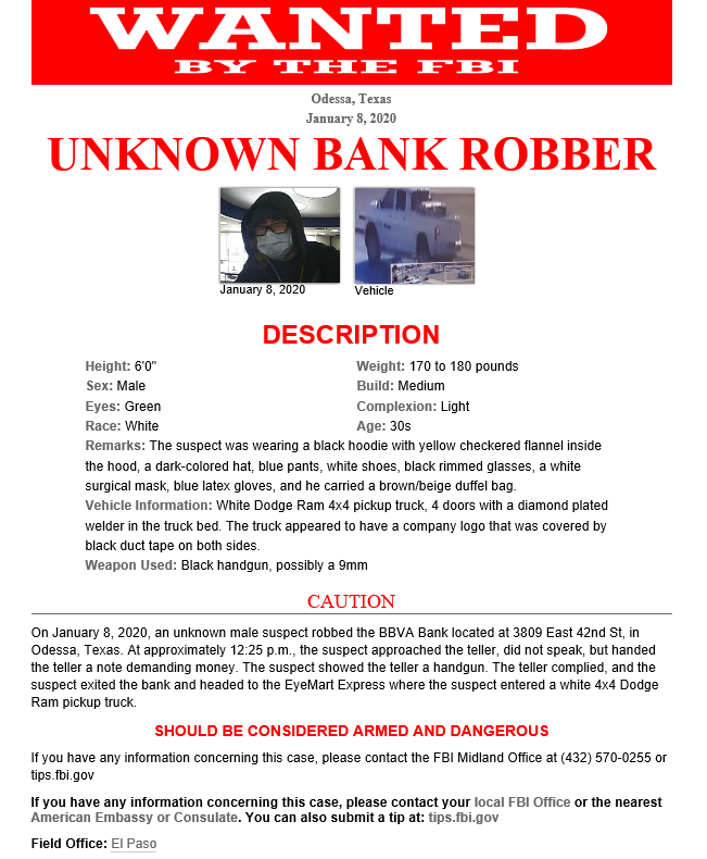 #FugitiveFriday: Jan 8th, an unknown male entered the BBVA Bank on East 42nd St in Odessa. He drove away in a white Dodge Ram 4x4 pickup truck with a welder in the bed. Anyone with info pls call our#FBI Midland office at (432) 570-0255 or Odessa CrimeStoppers at (432) 333-8477.pic.twitter.com/52KtUXRqmQ