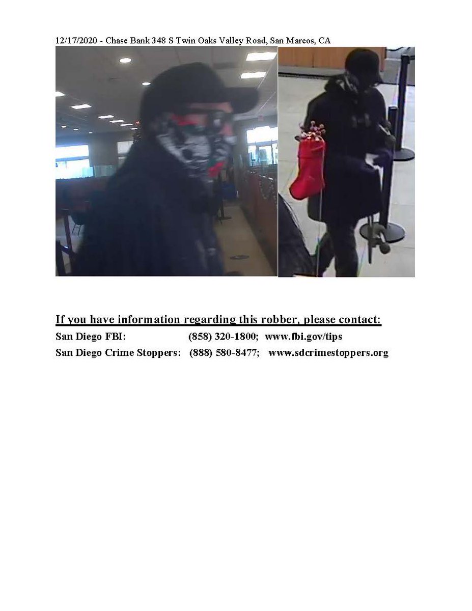 The #bankrobber is described as a thin white male around 25 to 30 years old, approximately 5'11", carrying a skateboard under his arm, and wearing a black hoodie sweatshirt, black pants, black plastic sunglasses, and a colorful tube-style mask pulled up over his face. #FBI