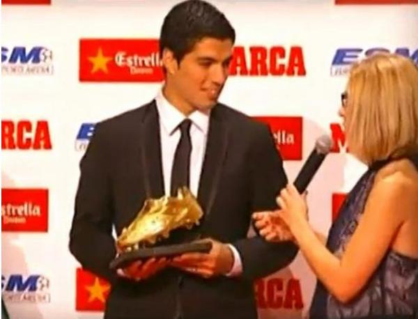 "@FCBarcelona: .@luissuarez9 with the 2013/14 Golden Shoe trophy#fcblive pic.twitter.com/8LPmWxpm1A”