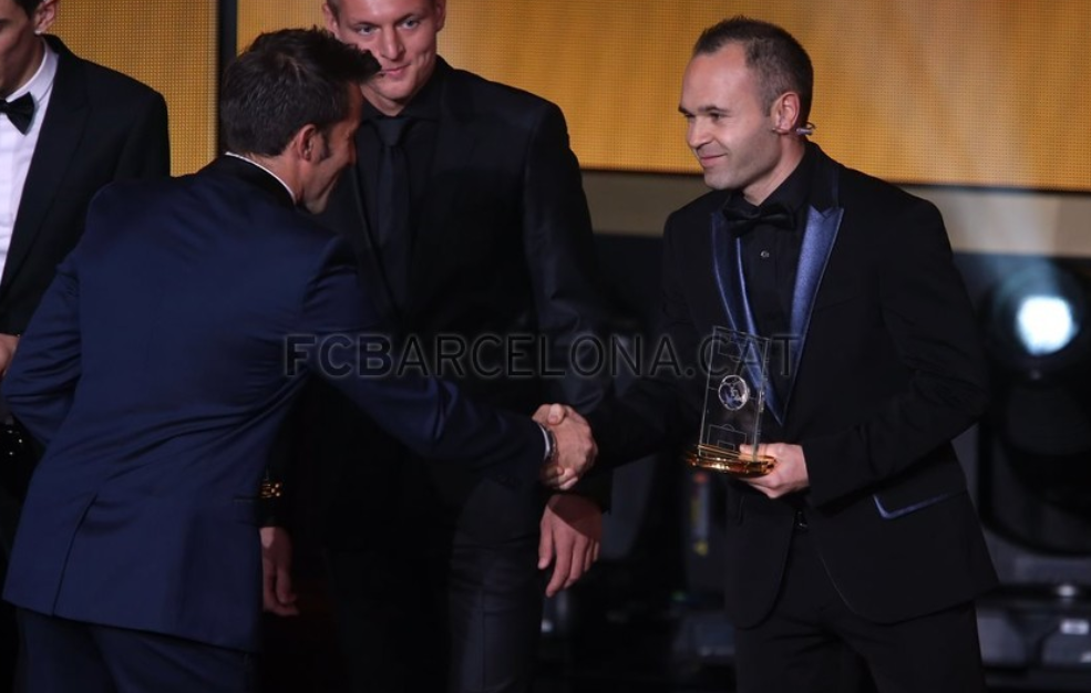 @FCBarcelona:#Photogallery Leo Messi and Andrés Iniesta in FIFA FIFPro team of the year http://ow.ly/Hc4RG pic.twitter.com/YV5eFgAKOC”