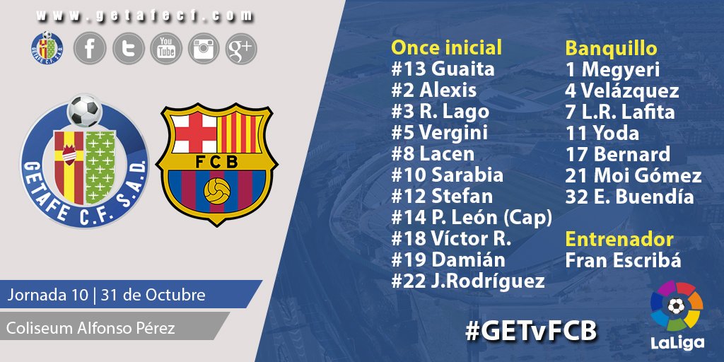 ¡Ya tenemos alineación para enfrentarnos al @FCBarcelona_es ! #VamosGeta #AupaGeta #GETvFCB pic.twitter.com/KXtMYnLmQd